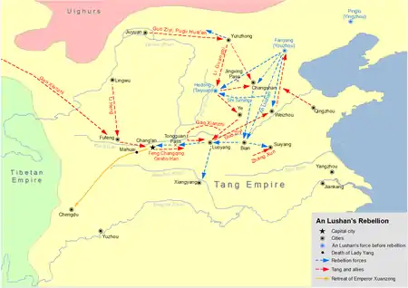 Em 24 de novembro de 757,[1] as forças Yan escalaram os muros da cidade, e as forças Tang não conseguiram repeli-las. Suiyang caiu assim, e Zhang Xun e Xu Yuan foram capturados. Yin Ziqi admirava Zhang e queria poupar sua vida, mas os subordinados de Yin acreditavam que permitir que Zhang permanecesse vivo poderia potencialmente fomentar uma revolta. Yin, portanto, executou Zhang e 36 oficiais-chave sob seu comando, incluindo Nan Jiyun e Lei Wanchun (雷萬春). Xu deveria ser entregue a Luoyang, mas no caminho para Luoyang, os soldados Yan ouviram que as forças Tang e Huige aliadas, comandadas pelo Príncipe Li Chu (filho do filho do Imperador Xuanzong, Imperador Suzong, que assumira o trono na confusão da Rebelião de Anshi), haviam capturado Luoyang, e eles mataram Xu em Yanshi (偃師, perto de Luoyang).[10]