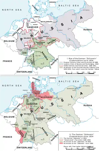 Fundado em 1834, o Zollverein (Deutscher Zollverein ou União do Uso Geral da Alemanha), originalmente planejado pela Prússia no século XIX, incluía, inicialmente, apenas os estados do norte, próximos aos territórios controlados pela Prússia, e foi visto como um modo de transportar bens, estimulando o comércio e a economia. A união entre os 39 estados foi o fruto dos burocratas prussianos ao longo de décadas. Por volta de 1848, a sua atuação havia aumentado, e incluía não só a maioria dos estados alemães como também o Império Austríaco e aqueles da Alemanha no Noroeste. Além de interesses econômicos, a Prússia desejava criar uma grande influência nos estados que dominava para poder futuramente realizar a unificação alemã.