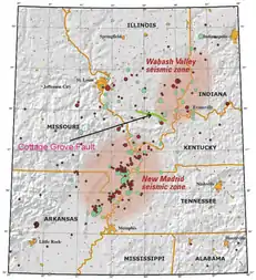 A zona sísmica de 240 km (150 milhas), se estende por cinco estados americanos entre: Illinois, Missouri, Arkansas, uma parte do oeste do Tennessee, perto do Lago Reelfoot. E ficando a sudoeste da Zona Sísmica do Vale Wabash em Indiana[3]