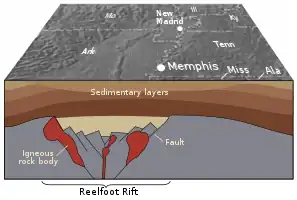 As falhas responsáveis pela zona sísmica de Nova Madrid são incorporados em uma característica geológica do subsolo conhecida como fenda de Reelfoot que se formou durante o rompimento do supercontinente Rodínia na era Neoproteozoica.[carece de fontes] O sistema de fenda resultante não conseguiu dividir o continente, mas permaneceu como um aulacogênio (uma cicatriz ou zona de fraqueza) no subsolo e suas falhas antigas parecem ter tornado a crosta terrestre na área de Nova Madrid mecanicamente mais fraca do que muito do resto da América do Norte. Esta fraqueza relativa é importante, porque permitiria que as forças compressivas leste-oeste relativamente pequenas associadas à contínua deriva continental da placa norte-americana reativassem falhas antigas em torno de Nova Madrid, tornando a área excepcionalmente sujeita a sismos, apesar de ser distante do limite da placa tectônica mais próximo.[12] Como outras fissuras antigas são conhecidas na América do Norte, mas nem todas estão associadas a sismos modernos, outros processos podem estar em ação para aumentar localmente o estresse mecânico nas falhas de Nova Madrid.[13] Além disso, sugeriu-se que alguma forma de aquecimento na litosfera abaixo da área está tornando as rochas profundas mais plásticas, o que concentraria a tensão de compressão na área subterrânea mais rasa onde ocorre a falha.[14]