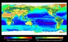 Áreas oceânicas pouco produtivas como o oceano tropical contêm pouco fitoplâncton e compostos orgânicos dissolvidos, apresentando coloração tipicamente azulada. Em águas produtivas, o vermelho é absorvido pela água e o azul pelos compostos orgânicos dissolvidos, deixando a água com coloração tipicamente verde.[2]