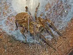 A secção frontal do corpo (o prossoma) é acastanhado, com grandes marcações mais escuras. O abdómen (opistossoma) apresenta marcas pretas na zona mediana. As pernas apresentam predominantemente coloração acastanhada salpicada por manchas mais escurecidas.