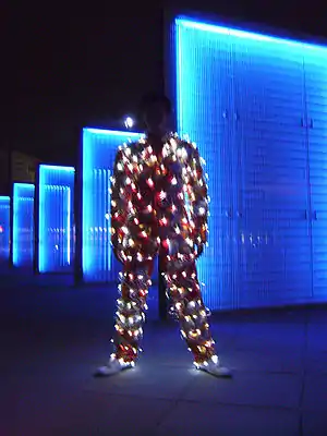 The idea of integrating the personality of the performer into the performance goes back to Brecht, who advocated a style of acting in which the personality of the actor is retained in the portrayal of the character: “the showman Laughton does not disappear in the Galileo whom he is showing.”[2] Performance art frequently goes a step farther, removing the character altogether and allowing the performers themselves to literally become the artwork. Performance art also differs from conventional theater in that it often does not enact a story, with a series of cause-and-effect events leading to an ultimate conclusion, as with conventional plot. The production is more likely to be a visual and conceptual experience in the way of a sculpture, painting, or abstract dance.
