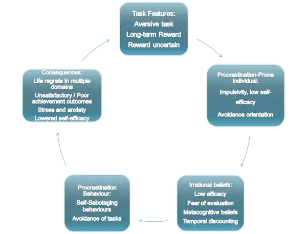 External Task features, such as an aversive task, long-term or uncertain reward interacts with internal variables, such as high trait impulsivity and/or low trait conscientiousness, low self-esteem, and avoidance orientation to goals. These create irrational beliefs about the situation, such as low-efficacy, fear of evaluation and failure, and metacognitive beliefs (both positive and negative), and temporal discounting. These create the behaviour of procrastination, the delaying of tasks and self-sabotage, which leads to the consequence of unsatisfactory outcomes, regret, and stress and anxiety. This lowers self-efficacy such that the individual is less likely to perceive that they have the skill to handle the next task that they encounter.