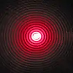 Red light diffracted by two slits (top) and by five slits (bottom)
