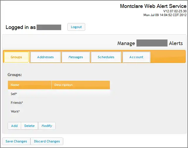 Instead of multiple pages showing one data table each, the rich client shows all tables as tabs (Groups, Addresses, Messages, and Schedules). Each tab includes a table displaying already present data, and a set of buttons to Add, Delete, or Modify data. These behave like radio buttons. Clicking Add, Delete, or Modify brings up a form appropriate for the current tab and action. The user can make multiple changes and revisions, which are not committed until the Save Changes button is clicked. The Discard Changes button allows the user to cancel all changes since the previous save.