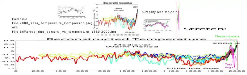 ![]() Derivative of c:File:2000 Year Temperature Comparison.png and c:File:Briffa-tree ring density vs temperature 1880-2000.jpg showing how the two graphs can be combined. This is less a scientific effort than an educational one: primitive and easy to understand. ![]() Derivative of c:File:2000 Year Temperature Comparison.png and c:File:Briffa-tree ring density vs temperature 1880-2000.jpg showing how the two graphs can be combined. This is less a scientific effort than an educational one: primitive and easy to understand. |