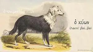 ὁ ποιμενῐκὸς κῠ́ων. ὁ κύων ὑλακτεῖ· βαύ, βαύ.
