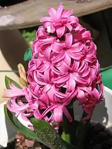 Borrowed from Ancient Greek ὑάκινθος (huákinthos, any of several dark blue flowers).