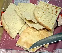 פיתה חתוכה לשני רבעים שלמים ושני רבעים מופרדים לארבע דפנות