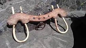 - yoke, a bar or frame by which two draught animals are joined at their necks