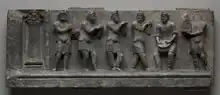 a Gandharan relief of سکا (sakā, "Scythian, Indo-Scythian") men playing instruments and dancing, Pakistan