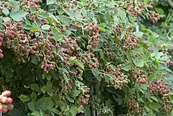 - In what concerns the bramble, it is well known, and in what concerns the mountain-rose and the dog-rose, it is well-known with the physicians as nisrīn; Abū Ḥanīfa said the mountain-rose resembles the rose and this resembles a bit the image of the bramble, and the fruit is similar to the dust-vine, it is red and resembles the unripe date, except that its tip is pointed, and in its inner there is a kind of wool, and its blossom is a white rose blossom with an admixture of red.