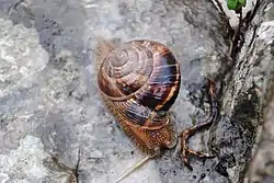 From Aramaic חְלָזֹונָא (ḥəlāzōnā), possibly from Ancient Greek ἑλικών (helikṓn); compare Hebrew חִלָּזוֹן (khilazón), Arabic حَلَزُون (ḥalazūn).