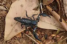 - scorpion; Any of the various arthropods in the arachnid order Scorpiones, characterised by the presence of two pincers and a curved tail with a venomous sting.