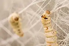 - silk; fine fibre extracted from the pupae of the silkmoth, Bombyx mori.