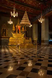 A white chàt is attached to the throne at the front. The throne at the back is flanked by two golden chàt