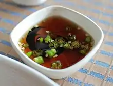 From พริก (prík, “chili”) + น้ำปลา (nám-bplaa, “fish sauce”).