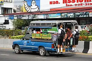 1. (รถ~) songthaew: a kind of share taxi in Thailand and Laos made out of an altered pickup truck with two bench seats along either side of the back.