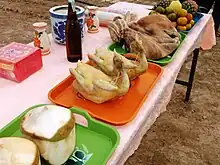 - (idiomatic) large meal, especially one complete with both meat and vegetables.