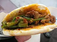 Many erroneously interpret this term as 肉 (ròu, “meat”) + 夾/夹 (jiā, “to sandwich; to press from both sides”) + 饃/馍 (mó, “bun”), i.e. “the meat sandwiches the bun”, which is obviously the opposite of reality.