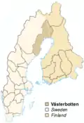 The historical region Westrobothnia (darkest brown) on a map of Finland and Sweden.