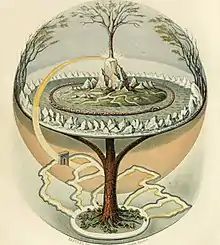 - (Norse mythology) An immense ash tree that is central in Norse cosmology, believed to connect the nine worlds.