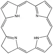 | Chemical structure (definition 2) of a P4O10 molecule attempting to show three-dimensional geometry | Simplified representation of the chemical structure of a chlorin molecule in which chemical symbols for carbon and hydrogen atoms are not explicitly shown |