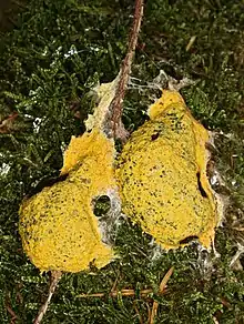 - Fuligo septica, a bright yellow slime mold.