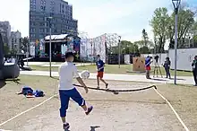 - (sports) A sport played with a ball over a net on a tennis-like court, with the ball similar to the football one, and the net to the tennis one.
