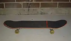 - (sports, recreation) A narrow, wooden or plastic platform mounted on pairs of wheels, on which one stands and propels oneself by pushing along the ground with one foot.