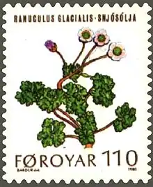 - glacier buttercup (Ranunculus glacialis), a flower, growing in the top of the mountains of the Faroe Islands.