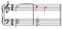 The treble C indicated in red has been held over from the first chord into the second chord, thus creating a suspension (sense 7)