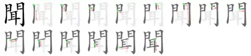 - O caractere representa uma orelha (耳) encostada em um portão (門), tentando ouvir do outro lado.