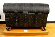 - caixa retangular com tampa convexa e geralmente revestida de couro cru