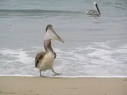 - (ornitologia) ave da ordem dos Pelecaniformes (família Pelecanidae) que tem como característica principal o longo pescoço que contém uma bolsa na qual armazena alimento