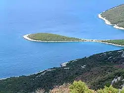 - porção de terra cercada de águas por todos os lados, com exceção de um, por onde mantém ligação com o continente