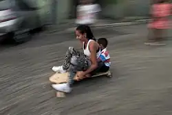 ![]() Crianças com carrinho de rolemã, disputando corrida ladeira abaixo |